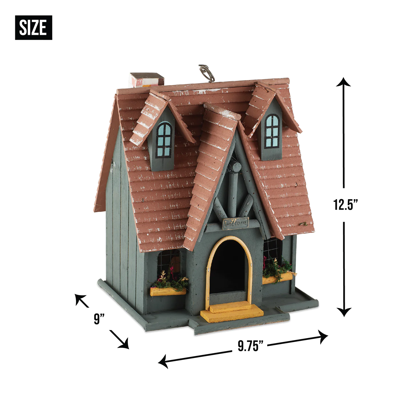 • Straight out of a fairy tale with beam-style trim, welcome sign, tall roof, and charming façade this birdhouse is bursting with storybook charm!