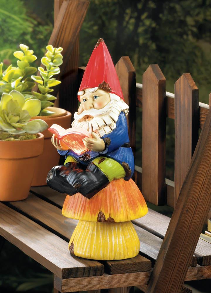 • This charming little gnome is lost in a good book, but you'll always be able to find him thanks to the solar panel that makes him glow!